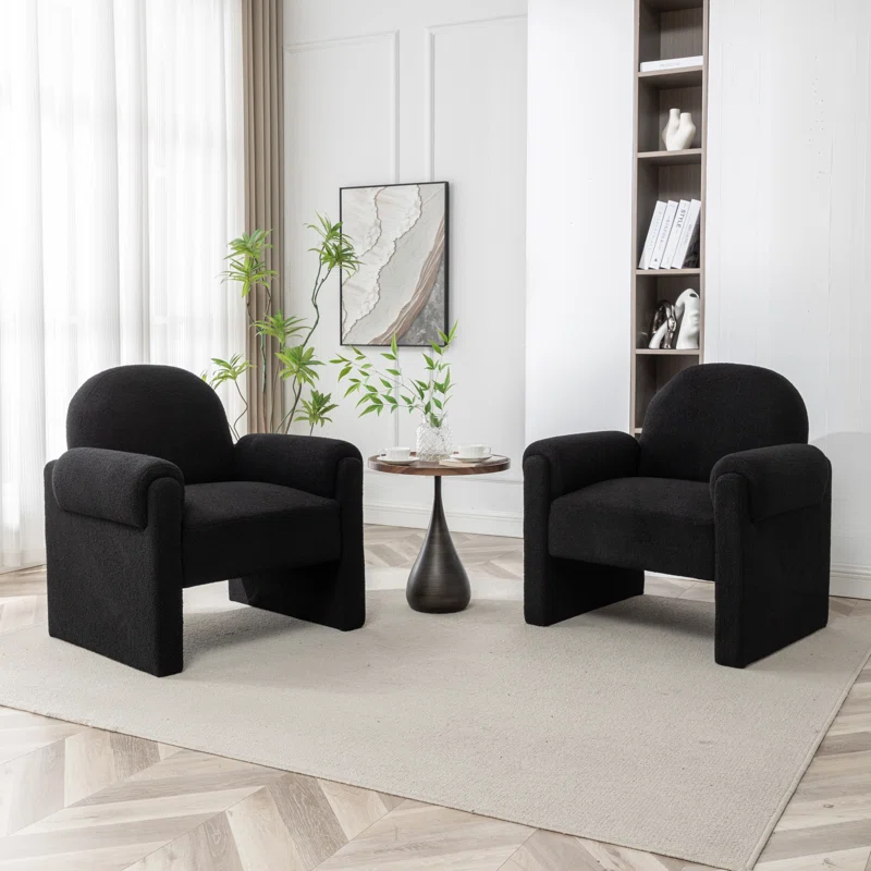 طقم كرسي أنيق مكون من قطعتين يتميز بذراعين مستديرين وقماش بوكلية ناعم، يجمع بين لمسات منتصف القرن والراحة العصرية، مثالي لغرف المعيشة أو النوم.