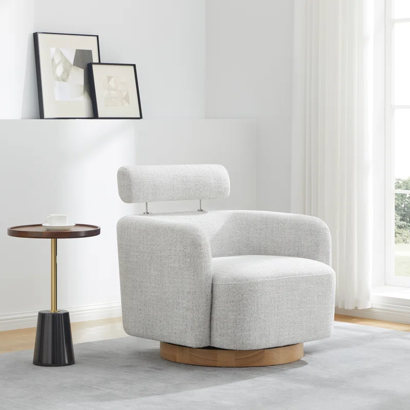 كرسي استرخاء أنيق ومريح بتصميم دوار، يتميز بإطار خشبي منحني ومسند رأس قابل للتعديل وتنجيد ناعم—مثالي للاسترخاء أو القراءة.