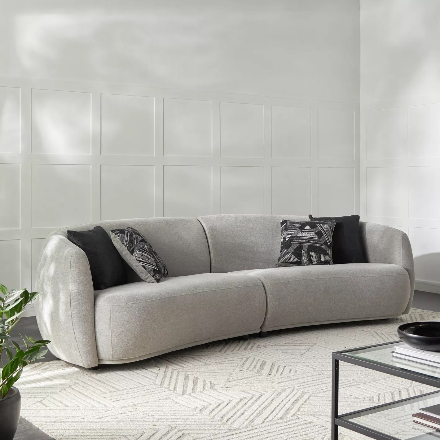 أريكة فاخرة بأربعة مقاعد، هيكل خشبي، وتنجيد ناعم بوسائد فخمة تناسب الديكور العصري.