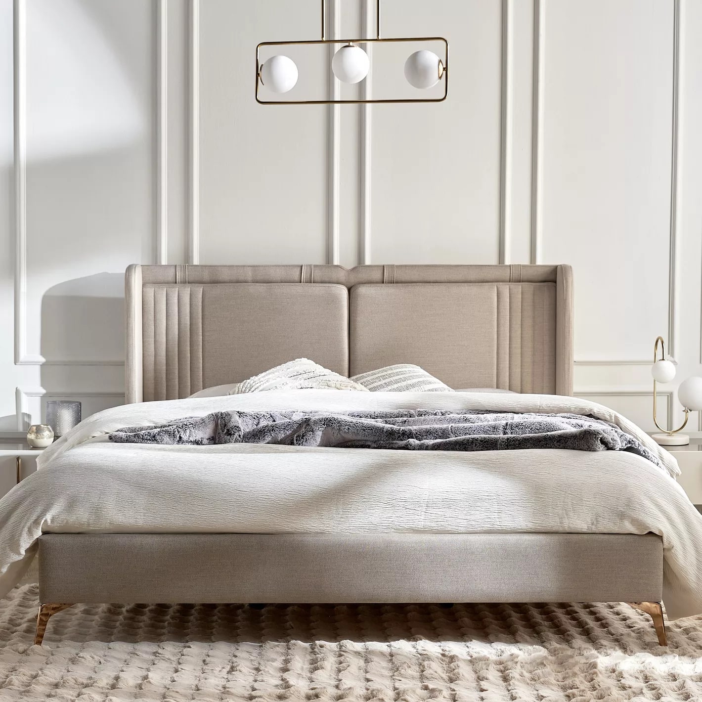 سرير كينج أنيق بتصميم مجنّح وأرجل ذهبية، يجمع بين الراحة والفخامة في تنسيق عصري.
