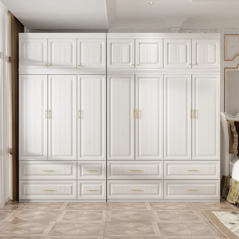 خزانة ملابس فاخرة مصنوعة من خشب طبيعي وهندسي، بتصميم أنيق مطلي بالأبيض، تضم 14 بابًا و8 أدراج خارجية مع قضيب لتعليق الملابس.