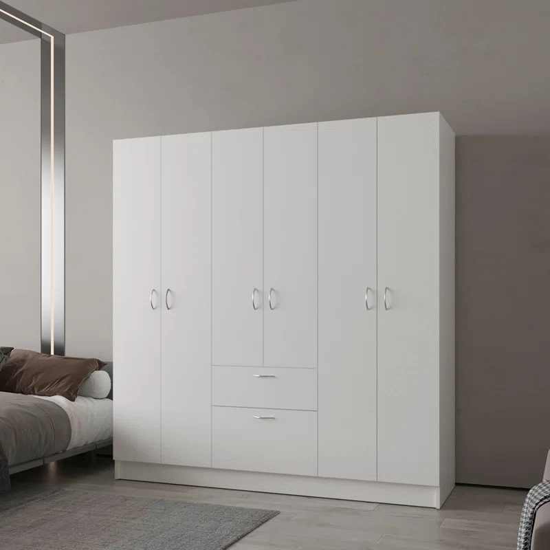 دولاب عملي متعدد الاستخدامات يوفر مساحة تخزين واسعة لتنظيم الملابس، الإكسسوارات، والمقتنيات الشخصية. يحتوي على علاقين للملابس، عدد من الأرفف المتنوعة، ودرج مركزي لتلبية كافة احتياجات التخزين. السطح مزود بطبقة ميلامين مقاومة للخدوش تحافظ على مظهره الأنيق مع الاستعمال اليومي. تصميم عصري بسيط بأربعة أبواب مثالي لغرف النوم أو غرف تبديل الملابس، مع أبعاد مدمجة تناسب معظم المساحات.