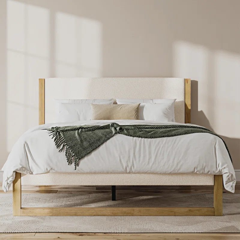 سرير أنيق يجمع بين الخشب الطبيعي والقماش الفاخر يضيف الهدوء والدفء لغرفة نومك.