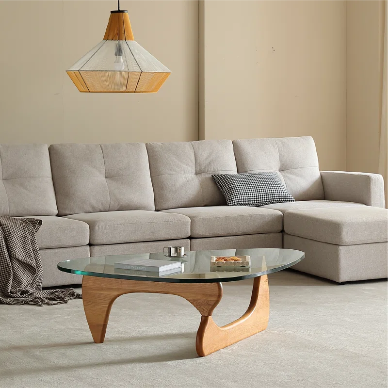 يتميز هذا الطاولة المثلثية بسطح زجاجي شفاف مع لمسة خفيفة من اللون الأخضر وقاعدة خشبية أنيقة، مما يخلق مظهرًا عصريًا مميزًا مستوحى من طراز منتصف القرن. إنها إضافة مثالية للمساحات المختلفة مثل غرف المعيشة، مناطق الترفيه، المكاتب، وغرف الاستقبال.