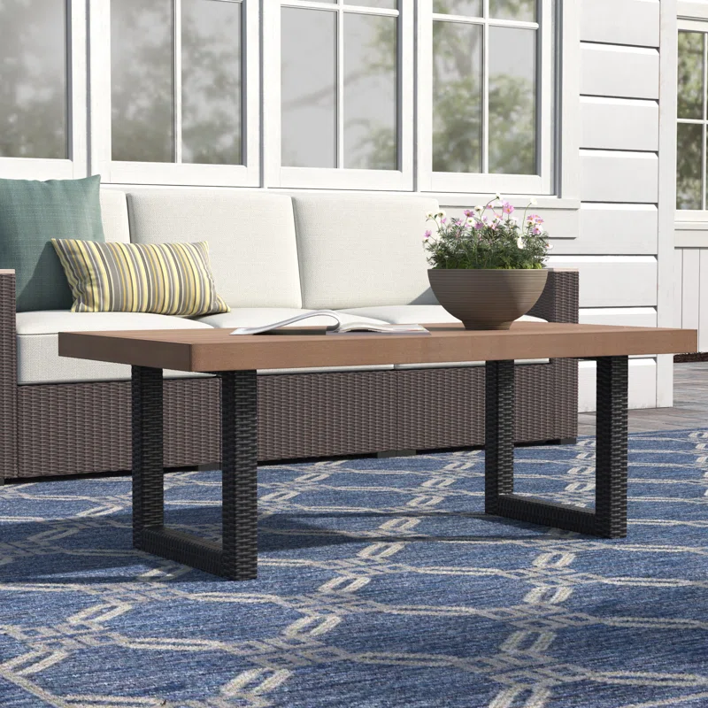 طاولة القهوة هذه هي قطعة أنيقة وعصرية لمجموعة الجلوس الخارجية الخاصة بك. إنها مبنية على إطار فولاذي، وتتميز بشكل خطي نظيف مع قاعدة مزدوجة على شكل دعامتين مغلفة بحبال الروطان الصناعي بتشطيب بني غني. سطح الطاولة المستطيل المشطوف مصنوع من ألواح صناعية خشبية مقاومة لجميع أنواع الطقس، وتعرض تفاصيل الحبوب المنقوشة. هذه الطاولة هي المنصة المثالية للمقبلات وأطباق الشواء وأباريق المشروبات الباردة في فناء منزلك أو شرفتك.