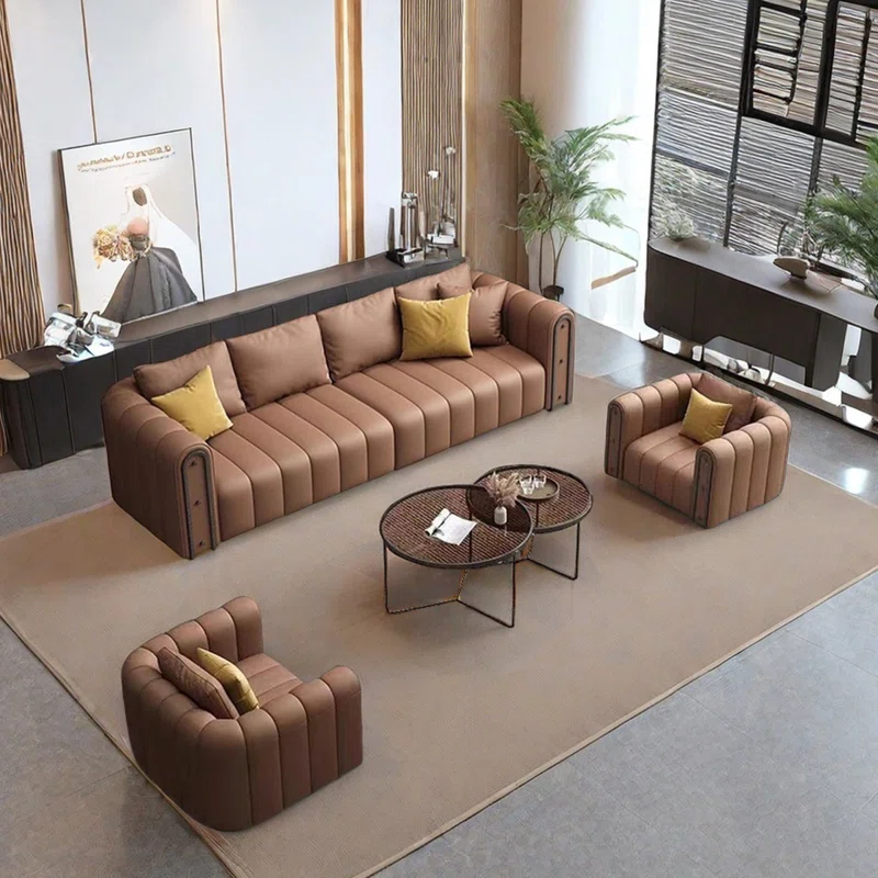 مصنوعة من جلد عالي الجودة وناعم، توفر الأرائك لمسة فاخرة وراحة فائقة. الجلد مصمم ليكون متين وسهل التنظيف، ما يضمن استخدامًا طويل الأمد وقليل الصيانة. ناعميته وقدرته على التهوية يجعله خيارًا مثاليًا لتجربة جلوس دافئة ومريحة.