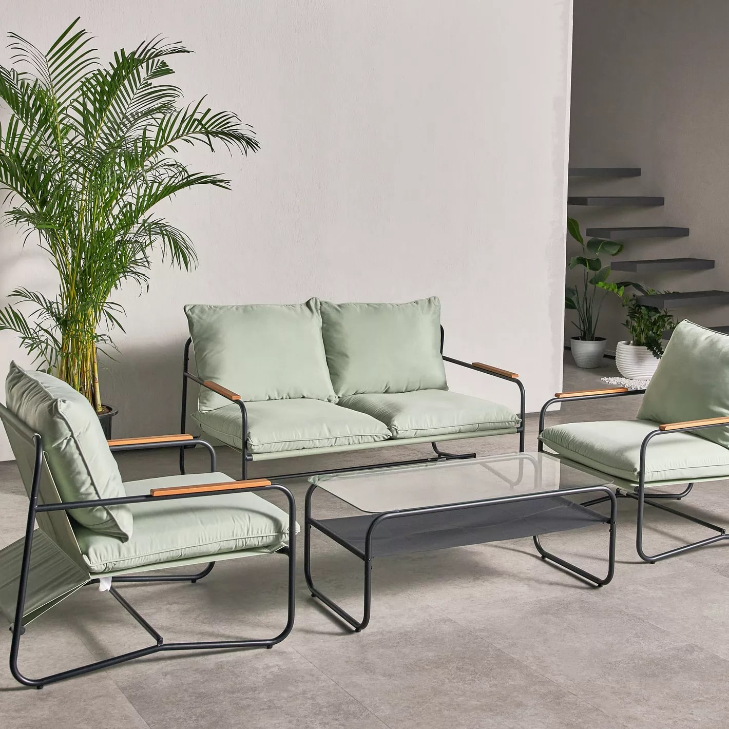 تم تصميم طقم الأرائك هذا للمنازل العصرية، وهو اختيار ذكي للمساحات المعاصرة. يتميز الطقم بإطار معدني ومفروشات من القماش، ويحتوي على أريكة بمقعدين مصحوبة بكرسيين بذراعين. يشتمل الطقم على طاولة قهوة معدنية ذات سطح زجاجي يضفي لمسة أنيقة على الطقم
