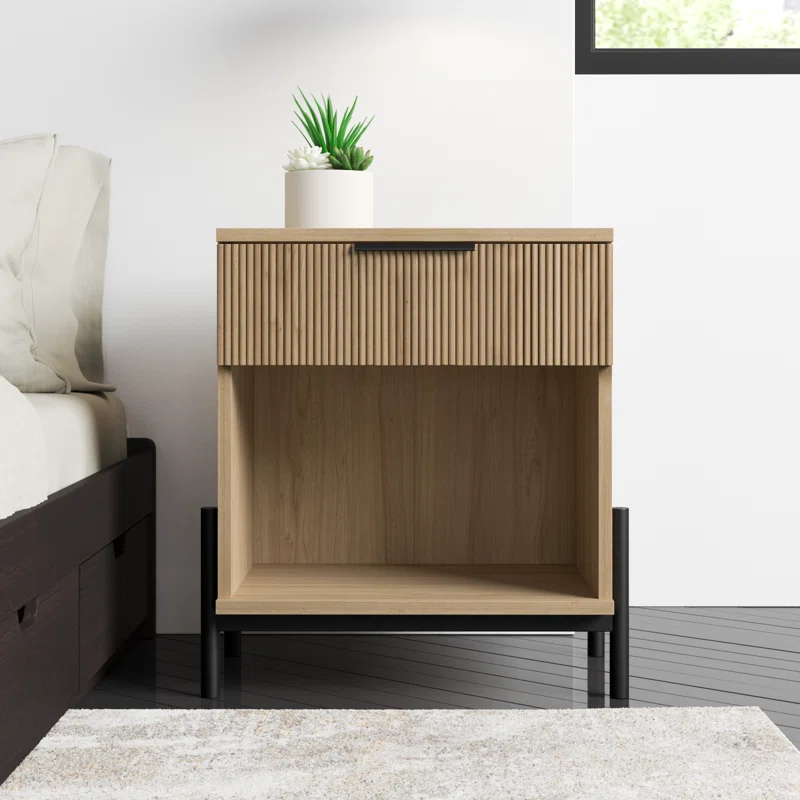 كومود بتصميم عصري بسيط مع درج أمامي مخدد ورف مفتوح، مثالي بجانب السرير.
