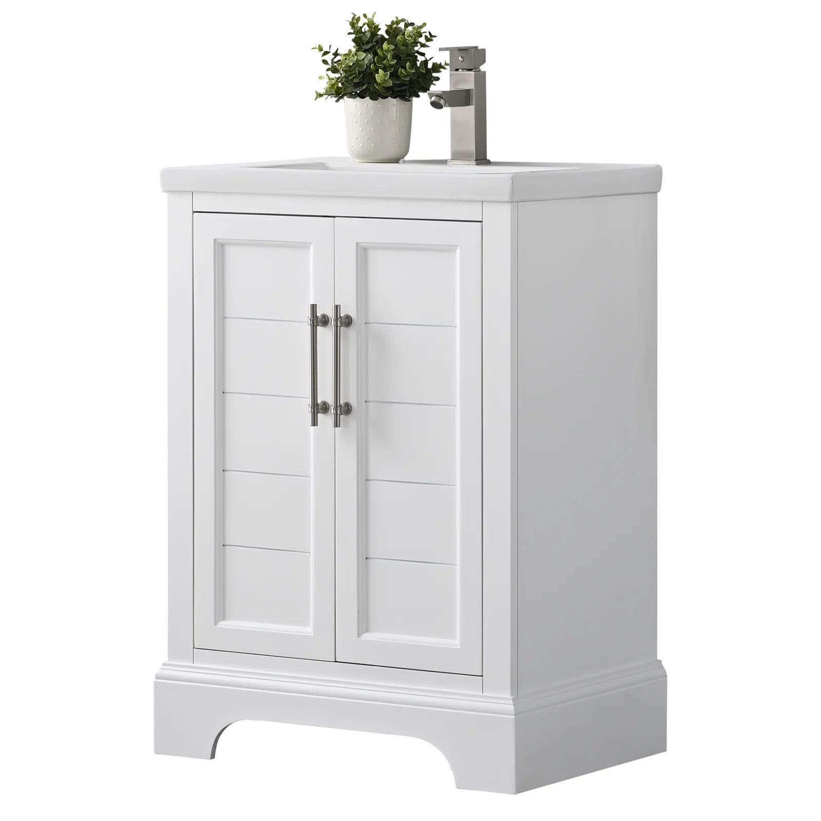 تجمع هذه الوحدة ذات عرض 24 بوصة (60.96 سم) بين الطراز الكلاسيكي ومساحة تخزين مريحة في حمامك. مصنوعة من خشب معالج، تحتوي على سطح من السيراميك الأبيض وحوض مستطيل تحت المنضدة. تفتح أدراج الخزانة الضيقة لتوفير سهولة الوصول إلى الأنابيب وتخزين مستلزمات التنظيف. تظهر الأبواب بألواح مبسطة مع مقابض معدنية وزخرفة خفيفة حول الأرجل. يعجبنا كيف يظهر تصميمها التقليدي خطوطًا نظيفة، وحجمها الصغير يجعلها مثالية للحمامات التي تركز على توفير المساحة. بالإضافة إلى ذلك، تأتي مع ثقب مُسبق الحفر في السطح لتركيب الصنبور (يُباع بشكل منفصل).