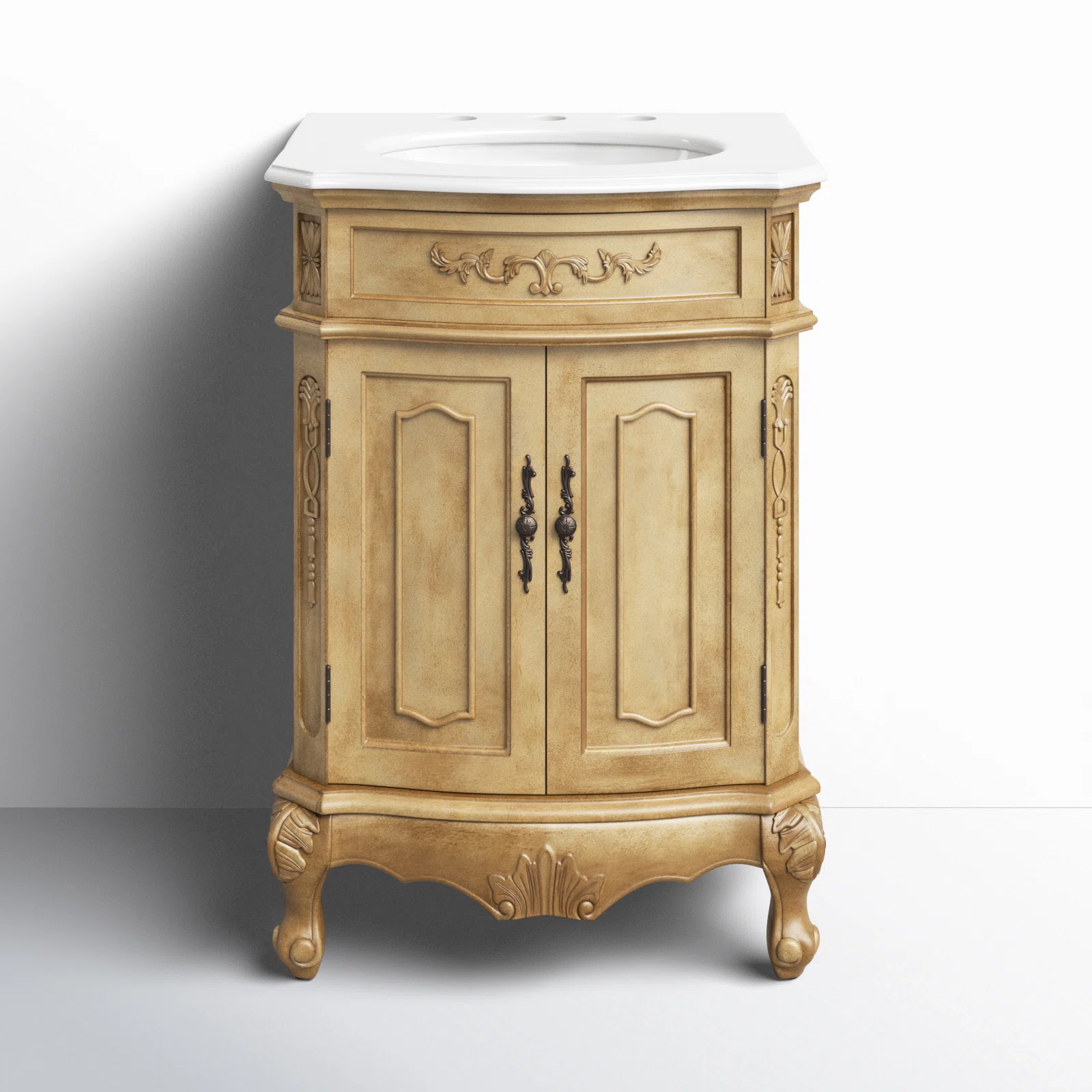 إطارها القائم بذاته مصنوع من مزيج من الخشب الصلب والخشب الهندسي ويتميز بتفاصيل خشبية منحوتة لإطلالة مستوحاة من الطراز العتيق. تحيط منضدة الرخام بحوض سيراميك دائري وتتضمن فتحات مسبقة الحفر لتركيب الصنبور. نحن نحب كيف أن الأرجل الأربعة القابريول والمقابض المتعرجة على الخزانة تعطي هذه الوحدة مظهر قطعة عائلية ثمينة. توفر المساحة الخزفية أسفل الحوض تخزينًا لمنتجات العناية الشخصية، والمناشف، ومنظفات الغسيل.