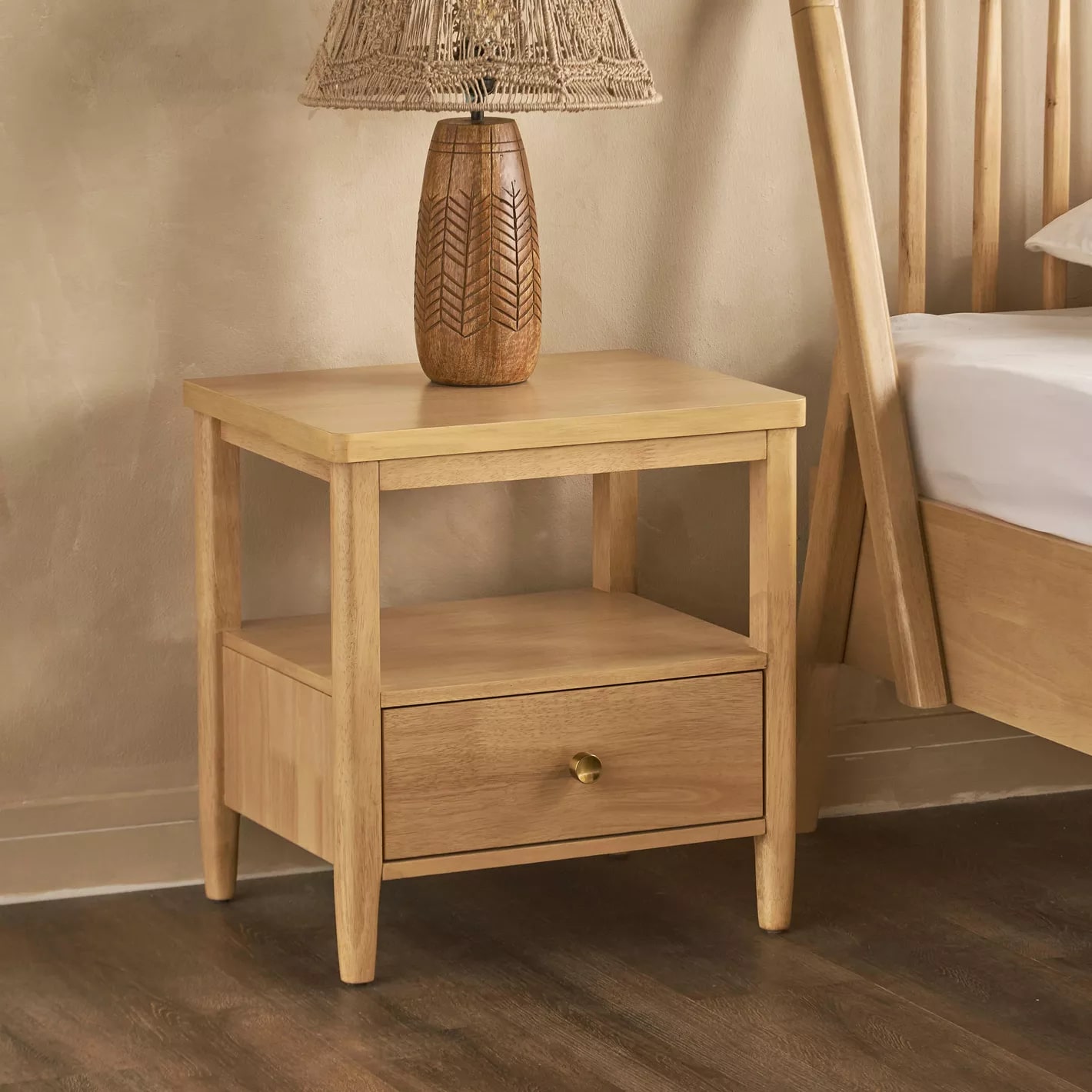 تتميز هذه المنضدة الجانبية العملية والأنيقة بأرجل خشبية صلبة ولون محايد، مما يجعلها إضافة عملية وأنيقة لغرفة نوم طفلك. تحتوي على درج واسع ورف مفتوح للتخزين، مما يعزز من وظيفتها العامة.