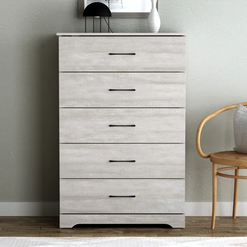 دولاب عصري بخمسة أدراج من خشب مهندَس، يتميز بتصميم نظيف وأنيق، مع مقابض سوداء للحصول على مظهر عصري وحديث. يوفر تخزينًا واسعًا وآمنًا.